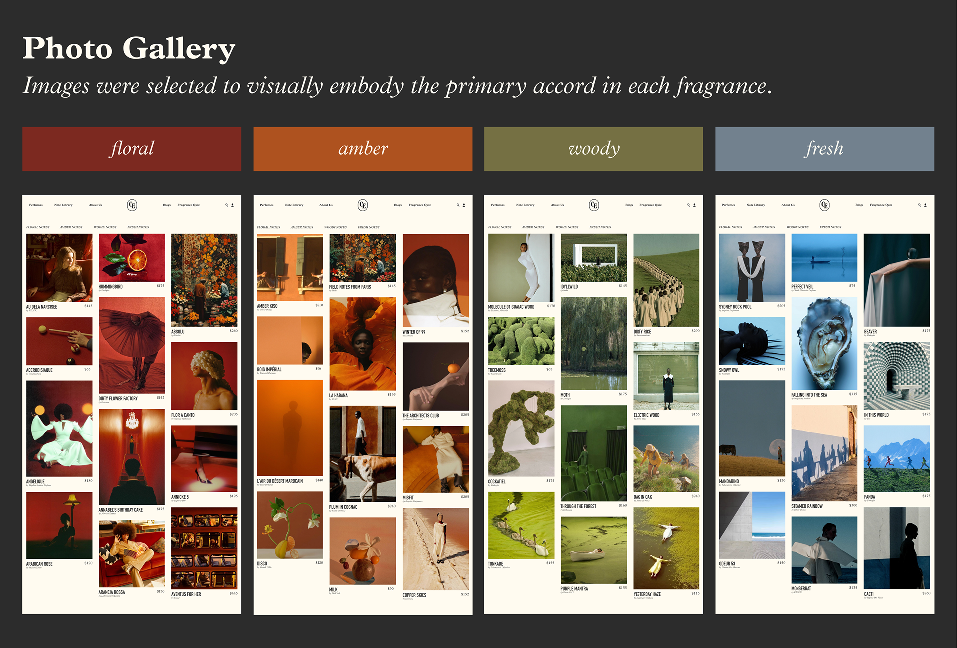 Celestial Essence is a space to explore and discover your signature scent. Through a short, guided quiz, the experience gently leads you toward fragrances that feel most like you. The site is designed to feel like scrolling through an art gallery, where scent is treated as something personal and expressive. Each fragrance family, floral, amber, woody, and fresh, is represented through color and visuals, giving you a sense of how a scent feels before you ever read the notes.